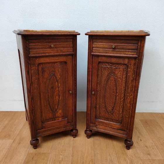 Questo set di comodini alti, antichi e vintage in stile francese con piano in marmo beige/giallo presenta un cassetto con anta sottostante. Sono molto eleganti e potrebbero essere utilizzati anche come mobiletto d'ingresso o come tavolino. In una vita precedente, uno specchio era montato tra i due mobili, da cui l'angolo sporgente e i fori sul retro. Questi fori possono essere riempiti con un pannello posteriore, che abbiamo anche fotografato.