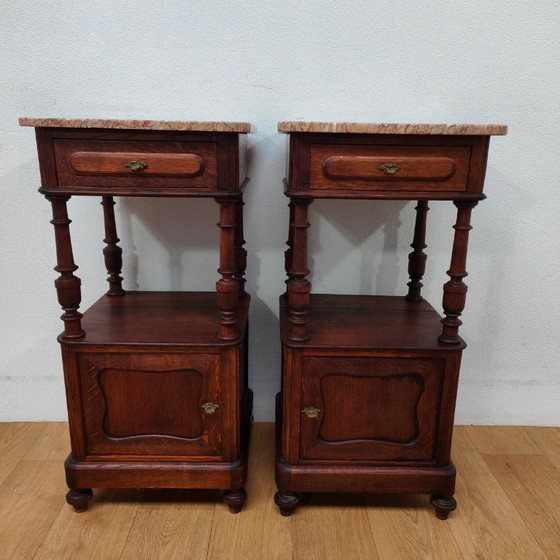 Affascinante set di comodini vintage con un elegante piano in marmo rosa salmone. Questi mobili combinano funzionalità con un design classico ed elegante e rappresentano una splendida aggiunta sia alla camera da letto che al soggiorno. La lavorazione del legno ha un aspetto caldo ed è splendidamente accentuata dal piano in pietra naturale, conferendo a ciascuno di questi mobili identici un carattere unico. Grazie alle loro dimensioni compatte, i mobili sono versatili: come comodino, complemento d'arredo o elemento decorativo in un ingresso o in un angolo lettura. I mobili sono dotati di un cassetto e di un'anta, il che li rende non solo decorativi ma anche pratici.
