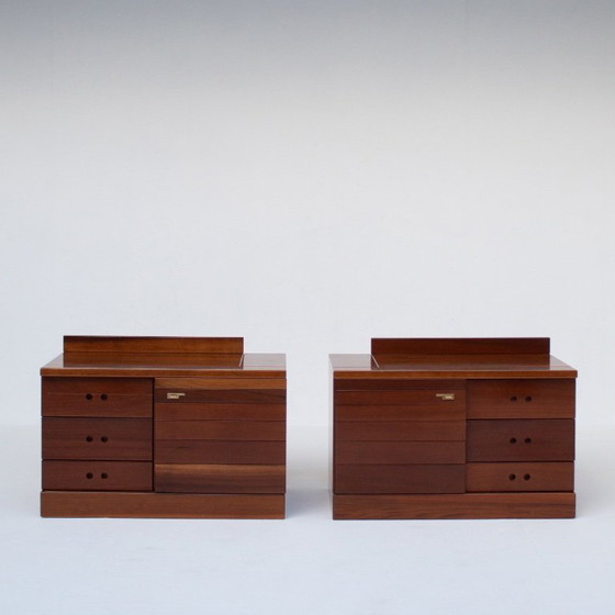 Questo raffinato set di comodini in legno italiano risale alla metà del XX secolo e riflette la sobria eleganza del design moderno italiano. Linee pulite, proporzioni equilibrate e calde tonalità del legno definiscono questi pezzi. I mobili combinano praticità e spazio contenitivo con una presenza calma e architettonica.