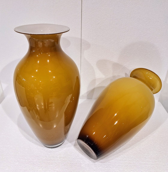 Un set di due grandi vasi di Murano degli anni '60. I vasi sono realizzati in vetro soffiato e incapsulato (giallo ambra all'esterno e bianco latte all'interno). Il ricco colore ambrato, che ricorda i tramonti dorati e le calde tonalità autunnali, aggiunge un tocco di luce e raffinatezza a qualsiasi interno e a qualsiasi stile. Questi vasi sono realizzati a mano da abili artigiani ed esemplificano la migliore tradizione vetraria italiana della metà del XX secolo.
