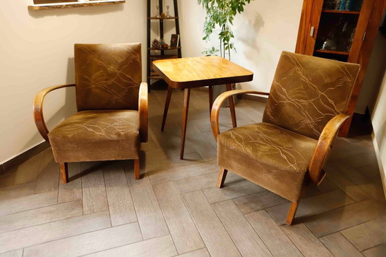 Questo set di due poltrone Halabala Type C degli anni '50 mette in mostra il design iconico creato dal leggendario designer ceco Jindřich Halabala. Questi pezzi senza tempo riflettono le eleganti linee curve e la maestria artigianale tipica del design cecoslovacco del dopoguerra.