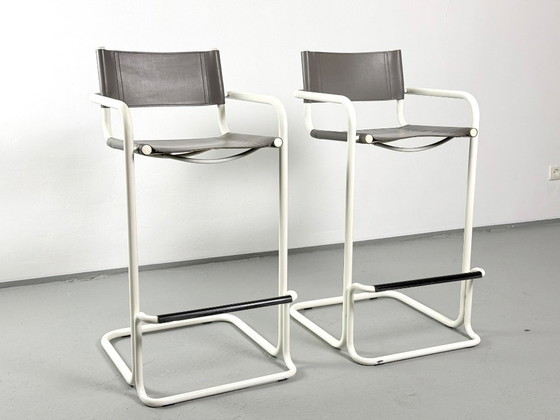 Eleganti sgabelli da bar con struttura tubolare in metallo laccato bianco e rivestimento in cuoio grigio. Un design elegante e minimalista nello stile di Mart Stam.