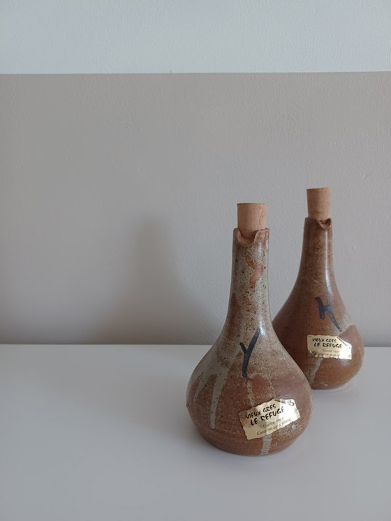 Set di due vasi da olio e aceto vintage, fatti a mano. In ceramica. Metà secolo.