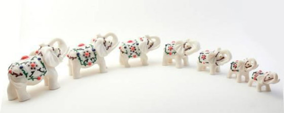 7 (!) Elefanti in resina color avorio con gemme, proboscide rivolta verso l'alto, portafortuna discendente