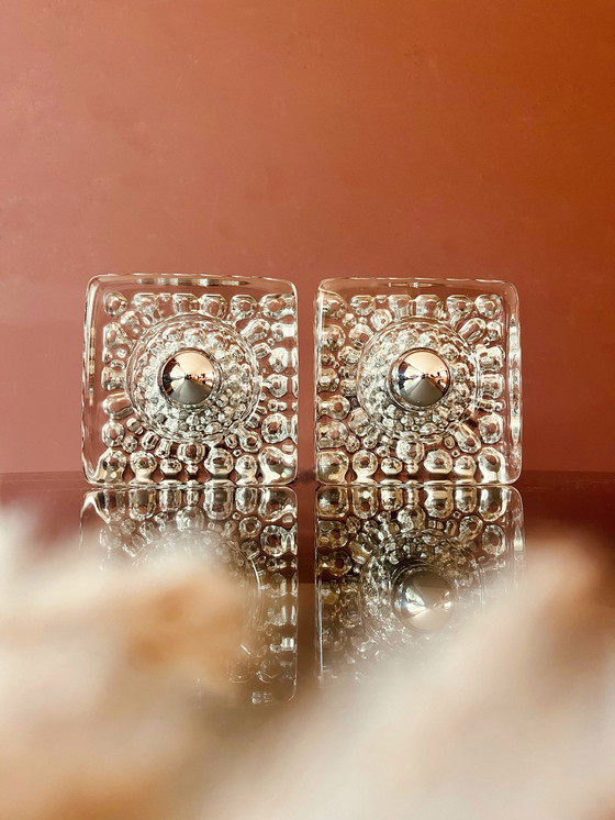 Wow che set! Queste due focaccine da parete Hillebrands Leuchten Ice Cube degli anni '70. Le perle del gelato! Sono due cubi di vetro ghiacciato con gocce incassate sul retro che creano un'atmosfera e un effetto grandiosi sulla parete. Due perle uniche degli anni '70! 😍