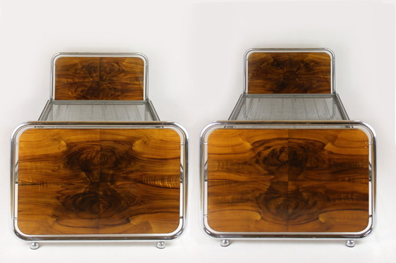 Questi letti in stile Bauhaus furono prodotti negli anni '40 in Cecoslovacchia. Dimensioni della base del materasso: 185x85 cm. Inviaci un messaggio con il tuo codice postale per fornirti un preventivo preciso per la spedizione.