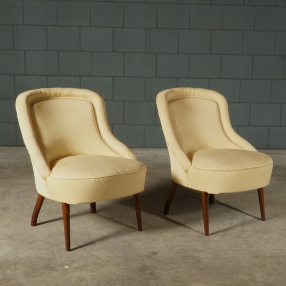 Queste poltrone meravigliosamente affascinanti provengono dalla Germania e risalgono agli anni '60. Sono rivestite in un bellissimo tessuto giallo chiaro di alta qualità con un motivo giocoso. Le gambe sono in noce marrone scuro, creando un grazioso contrasto con la tappezzeria chiara. Oltre al loro splendido design, le sedie sono anche molto comode. Considerata la loro età, sono in buone condizioni vintage. Hanno ancora il loro rivestimento originale, che purtroppo presenta alcune piccole macchie in alcuni punti (vedi foto), ma nessun danno o macchia importante. Bellissime sedie pronte all'uso o da rivestire con un tessuto diverso, se desiderato.