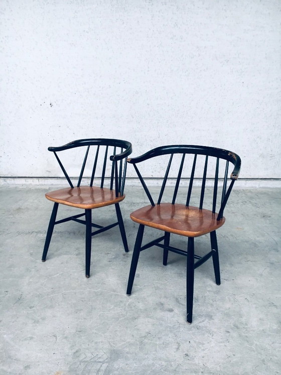 Set di 2 poltrone vintage in stile "FANETT" di design scandinavo Mid-Century Modern, Danimarca, anni '50. Nello stile di Ilmari Tapiovaara per Edsby Verken. Set di poltrone con schienale curvo e struttura in betulla e lacca nera. Sedie fatte a mano, visibili dalla differenza di larghezza dello schienale curvo. Entrambe sono in buone condizioni originali, usate, con normale usura e patina dovute al tempo e all'uso. Ogni sedia misura 78,5 cm x 61 cm / 57 cm x 46 cm.