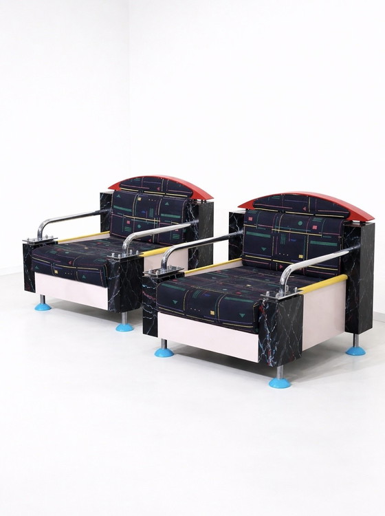 Splendida coppia di poltrone lounge, disegnate dall'architetto olandese Wim Hofman negli anni '80. Caratterizzate da una composizione architettonica di grande impatto. Realizzate con pannelli effetto marmo nero, braccioli tubolari cromati e un originale rivestimento geometrico in colori primari. Il design gioca con contrasti, ritmi e forme, elementi tipici del postmodernismo del periodo Memphis.