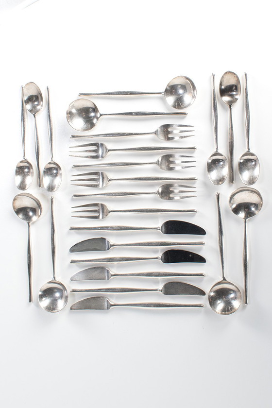 Set di posate Don Wallace disegnato negli anni '60 per Lauffer. Questo set da 24 pezzi, denominato "Design Three", è composto da 6 coltelli, 6 forchette, 6 cucchiai e 6 cucchiaini da dessert. Dal design accattivante e realizzato in acciaio inossidabile di alta qualità. In buone condizioni vintage.