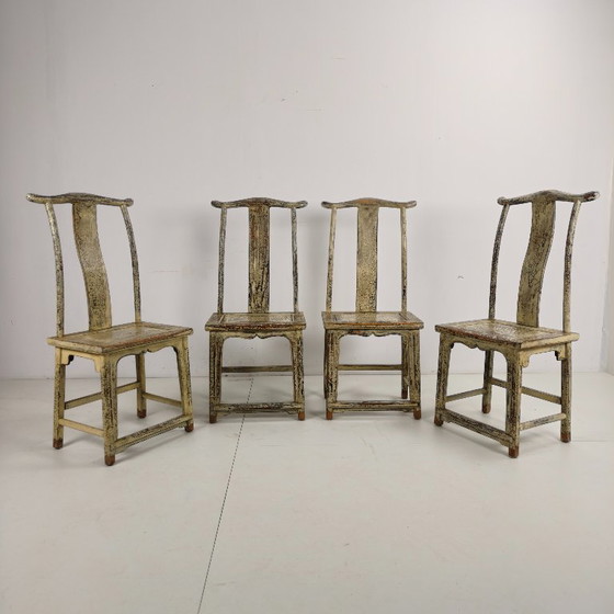 Set di quattro autentiche sedie cinesi con schienale a giogo della fine del XIX secolo (circa 1890). Le sedie mantengono la loro finitura originale verniciata di bianco, con splendide crepe dovute al tempo che ne esaltano il carattere e l'autenticità.
