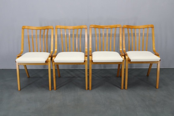 Questo raffinato set di quattro sedie da pranzo di metà secolo è stato prodotto da Jitona in Cecoslovacchia negli anni '60. Realizzate in legno massello di faggio e compensato di faggio sagomato, le sedie presentano proporzioni eleganti e linee moderniste pulite, tipiche del design mitteleuropeo dell'epoca.