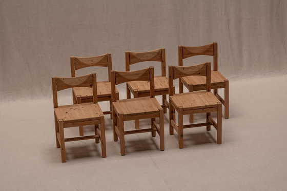 Set vintage di sei sedie da pranzo minimaliste modello 'Hongisto'. Disegnate da Ilmari Tapiovaara per Laukaan Puu nel 1963, Finlandia. Realizzate con una solida struttura in legno di pino. Design molto puro e architettonico con dettagli sorprendenti. In ottime condizioni. Animato dalla composizione giocosa delle venature del legno. Prezzo per il set di sei.