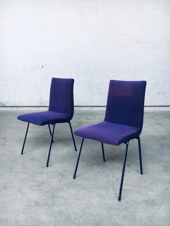 Set di 2 sedie da pranzo ROBERT, design vintage Mid-Century Modern di Pierre Guariche per Meurop, realizzate in Belgio tra la fine degli anni '50 e l'inizio degli anni '60. Tessuto viola originale sulla seduta, su base in metallo nero, con piccoli fermi originali ai piedi. Entrambe le sedie sono in ottime condizioni. Il tessuto presenta qualche scolorimento in alcuni punti. Colore raro per queste sedie. Ogni sedia misura 84 cm x 42 cm x 50 cm.