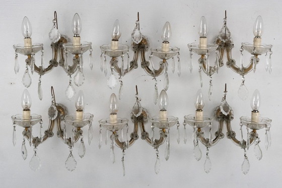 Set di sei appliques Maria Teresa in cristallo e ottone, prodotte in Italia negli anni Quaranta. Buone condizioni d'epoca con normali tracce d'età e d'uso. Perfettamente funzionante con lo standard UE, adattabile su richiesta allo standard USA.