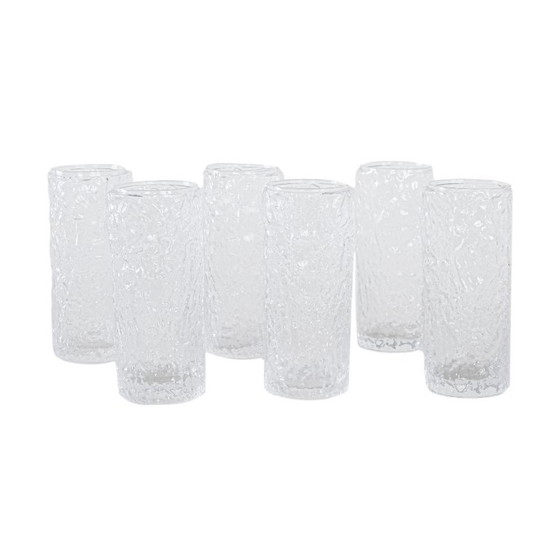 Un set di sei bicchieri vintage degli anni '70, caratterizzati da una forma scultorea originale che ricorda la struttura del ghiaccio. Il design distintivo li rende perfetti per gli stili mid-century e retrò. Ideali per servire acqua, bevande o whisky, e al contempo un interessante elemento decorativo per la tavola.