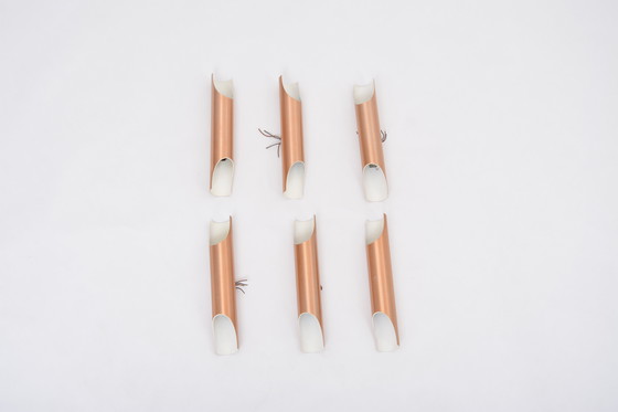 La designer industriale finlandese Maija Liisa Komulainen (1922) progettò questa lampada nel 1964, ispirandosi alle canne d'organo di una chiesa. Chiamò il modello "Fuga". L'azienda olandese Raak Amsterdam produsse questo modello in diverse varianti. Si tratta di un set di sei lampade da parete individuali. La lampada è realizzata in metallo color rame spazzolato e presenta un attacco su due lati per una lampadina E26/E27. Le lampade recano ancora l'etichetta originale del produttore.