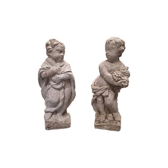 Coppia di statue da giardino in cemento vintage degli anni '70/'80. Le statue decorative da giardino raffigurano un ragazzo con il mantello e un altro con un grappolo d'uva. Sono in stile XVII/XIX secolo, il che conferisce loro un aspetto classico. Sono state dipinte di bianco e hanno acquisito una splendida patina.