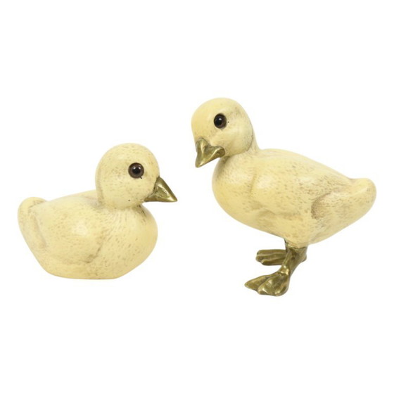 Simpatiche statuette vintage a forma di anatra, realizzate in resina; zampe e becco sono in ottone e occhi in vetro. Oggetti d'arte vintage di Elli Malevolti, Italia, seconda metà del XX secolo.