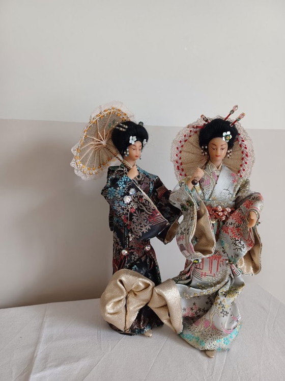 Set di due statuette vintage di geisha/maiko giapponesi, prodotte tra la fine degli anni '70 e gli anni '80. Entrambe le statuette sono realizzate con uno stile estremamente dettagliato e sono pensate come elementi decorativi di alta qualità per interni.