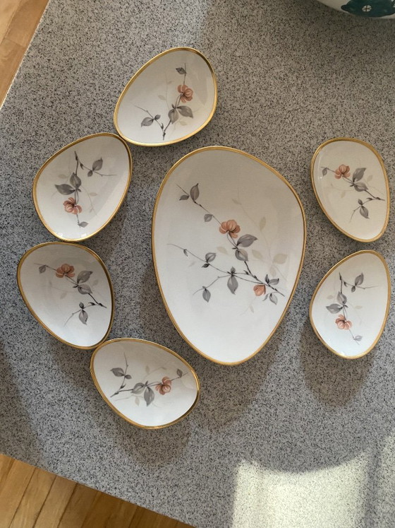 Uno splendido e raro servizio da tavola vintage di KPM (Krister Porzellan-Manufaktur), azienda tedesca del gruppo Rosenthal. Questo servizio presenta una sofisticata forma a "uovo organico", tipica del design di alta gamma del Mid-Century Modern.