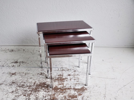 Questo set di tavolini da 3 pezzi è una splendida aggiunta a qualsiasi interno. I tavolini sono realizzati in legno con struttura in metallo, per garantire una struttura robusta e durevole. Il colore marrone del legno contrasta splendidamente con il metallo argentato, conferendo un aspetto elegante. Questo set è ideale per essere utilizzato come tavolini in salotto o come elementi decorativi in altre stanze.