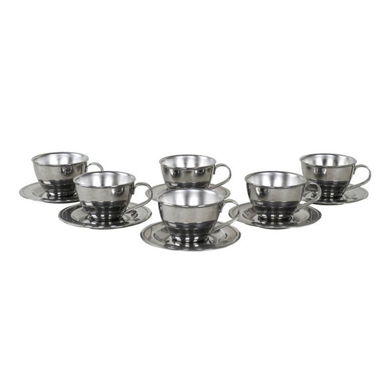 Set di 6 tazze con piattini. Realizzato in acciaio inossidabile lucidato. Design semplice e senza tempo in stile modernista, probabilmente degli anni '70-'80. La loro solida struttura le rende perfette per l'uso quotidiano e per una collezione vintage. Ideali per gli amanti delle forme minimaliste e resistenti.