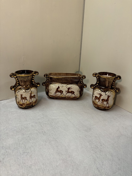 Questo raffinato set di vasi belgi di metà secolo incarna l'eleganza e la maestria di un'epoca passata. L'intricato design, caratterizzato da graziosi motivi di cervi, è splendidamente reso nei caldi toni del marrone e del bianco, accentuati da lussuosi dettagli dorati. Questi vasi in ceramica non sono solo funzionali, ma sono anche un'importante elemento decorativo in grado di elevare qualsiasi ambiente.