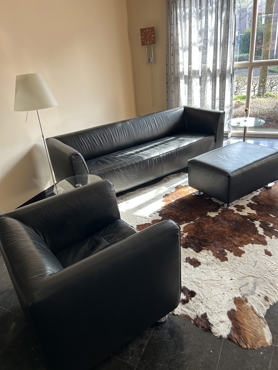 Set in pelle nera, un classico del design, della serie Gelderland 4800. Il set è composto da un divano a 3 posti, una poltrona e un bellissimo pouf coordinato. Vendiamo l'intero set al prezzo competitivo di €750.