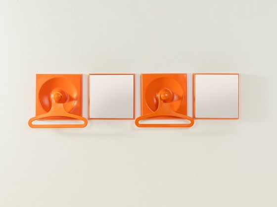 Set di armadi Space Age QUADRO di Jürgen Lange per Schönbuch degli anni Settanta. Struttura in plastica con due specchi, due appendiabiti e tre appendini in arancione. Ottima fattura, materiali di alta qualità. Prodotto in Germania. Design: Jürgen Lange, produttore: Schönbuch (marchio sul retro).