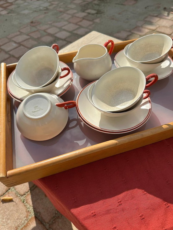 Het rood van de rood geverfde oortjes is hier en daar verdwenen. Aan de binnenkant van de kopjes zijn kleine barstjes te zien. De set is niet meer compleet: 7 kopjes en 5 schoteltjes.