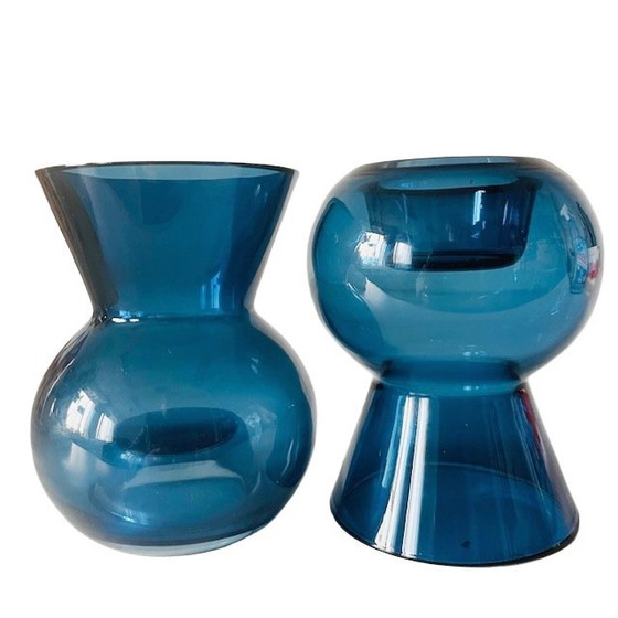 Un grazioso set di due vasi Diabolo in vetro soffiato a bocca blu della serie "Stockholm", disegnati da Anne Nilsson per IKEA negli anni '90.