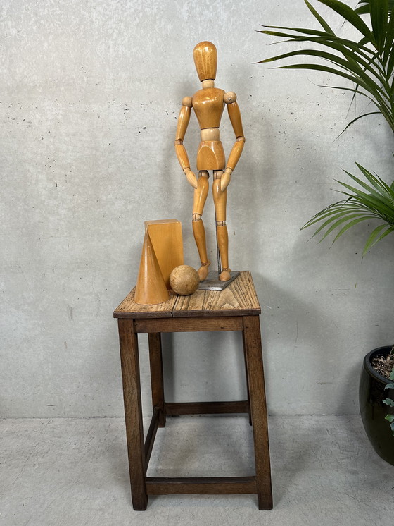 Set vintage di modelli da disegno in legno. Modello anatomico XL di donna. Altezza: 68 cm. Larghezza: 18 cm. Profondità: 18 cm. È montato su un supporto. Parti del corpo mobili. La posizione del corpo è facile da regolare. 3 figure spaziali, tra cui cono, sfera e raggio. Altezza: 20 cm. Larghezza: 10 cm. Diametro sfera: 9 cm. Molto decorativo. Peso del set: 4,6 kg.
