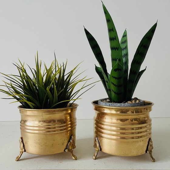 Set vintage di vasi da fiori in ottone e oro con zampe di leone, anni '50