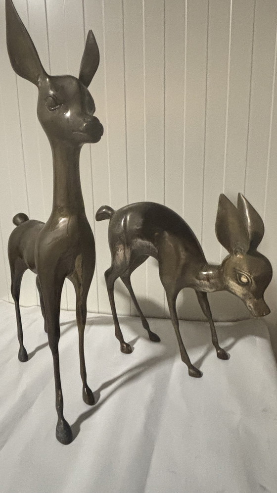 Questo splendido set di due statuette in ottone raffiguranti Bambi, risalenti agli anni '60, emana un fascino senza tempo. Le forme aggraziate e la lucentezza dell'ottone rendono queste statuette un'elegante aggiunta a qualsiasi interno. Perfette per gli amanti dell'arredamento vintage e degli oggetti d'arte, queste statuette donano un tocco di nostalgia e raffinatezza al vostro spazio.
