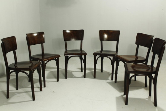 Sedie da pranzo Thonet dopo 90 anni di servizio pubblico, con una splendida patina e pronte per essere riutilizzate. Il set è composto da quattro sedie H-48 e due sedie H-47; la differenza tra le due è che la sedia H-48 ha una traversa aggiuntiva tra le gambe. Tutte e sei le sedie sono state pulite.