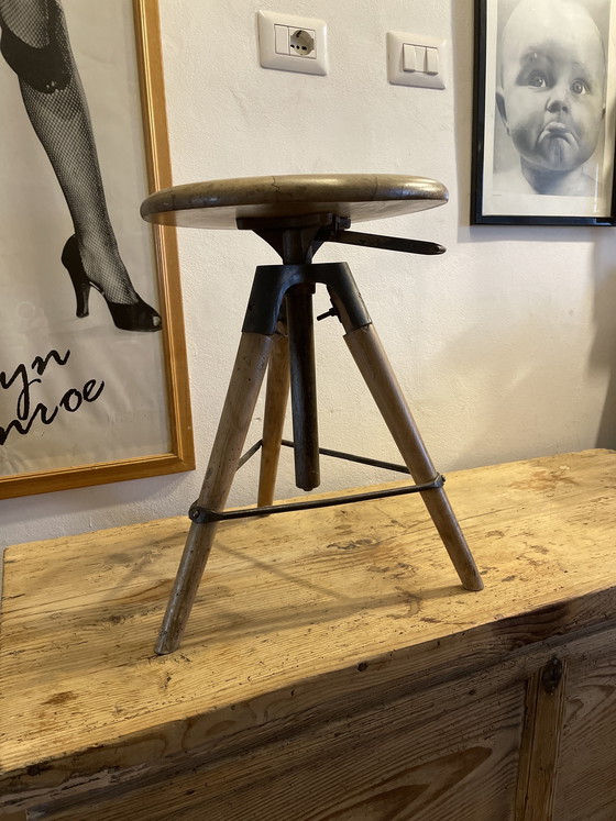 sgabello è un modello da atelier in stile industriale, simile a produzioni italiane degli anni '50 come quelle di Antonio Ferretti, caratterizzato da una struttura in metallo e una seduta in legno regolabile a vite. Due piccole macchie del legno bicolore