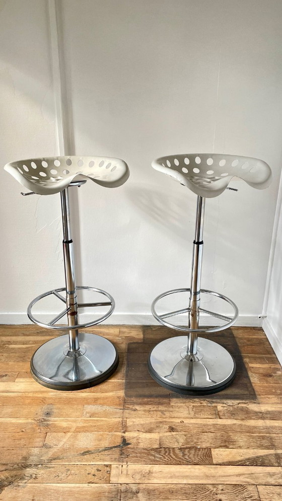 Questi sgabelli da bar regolabili in altezza, noti anche come "sedute telescopiche", sono estremamente comodi grazie al meccanismo a cordino. Realizzati interamente in acciaio laccato bianco crema e cromato, le sedute ruotano sul proprio asse e sono dotate di un rivestimento in materiale sintetico antiscivolo con bordo alla base. Questi due pezzi sono davvero unici e senza tempo. Venduti singolarmente, due disponibili in magazzino.