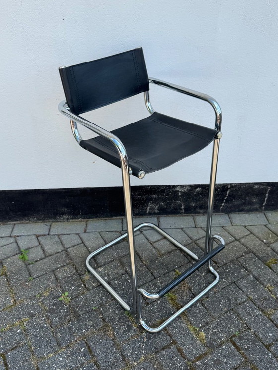 Nello stile di Mart Stam, questo sgabello da bar con influenze Bauhaus è davvero bello. Realizzato in pelle nera con una struttura in acciaio tubolare. Lo sgabello è in ottime condizioni e pronto per essere utilizzato. Il design è classico e si adatta a molti tipi di decori e interni.