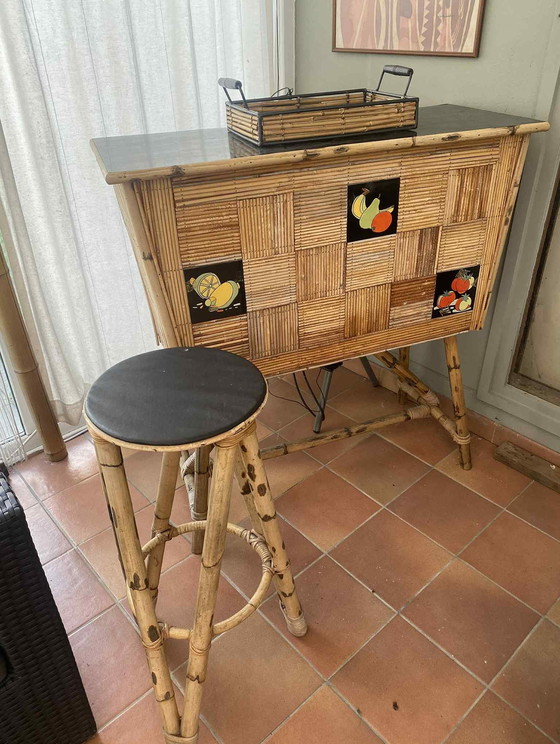Bellissimo bancone bar vintage in bambù con sgabello abbinato. Questo bancone bar unico nel suo genere è un vero e proprio elemento di spicco per la vostra casa o il vostro giardino. Il bancone è in buone condizioni e ha un aspetto caldo e naturale. Perfetto per servire drink e creare un'atmosfera accogliente. Siamo aperti su appuntamento il sabato dalle 10:00 alle 17:00.