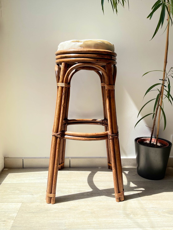 Sgabello da bar in legno curvato degli anni '50. Dona un tocco vintage e autentico alla tua cucina con questo sgabello elegantemente curvo. Alcune delle rilegature sono in pelle, a testimonianza della sua età e della sua lavorazione artigianale. 📌 Condizioni: → Ottime condizioni generali. → Bella patina. → Venduto senza cuscino. Dimensioni: → Altezza: 79 cm → Larghezza: 55 cm → Larghezza seduta: 35 cm → Peso: 3,2 kg