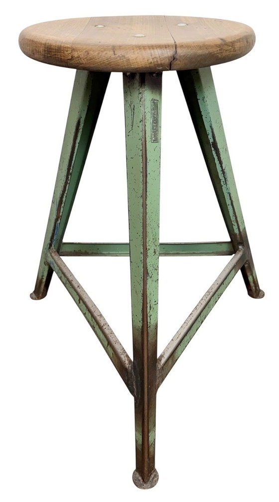 Sgabello industriale vintage prodotto nell'ex Cecoslovacchia negli anni '60. Presenta una seduta in compensato e una struttura in metallo verde. Il peso dello sgabello è di 4,7 kg.