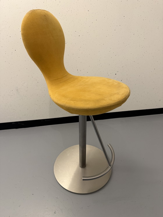 Questo sgabello Eight di Varièr ha un rivestimento in tessuto giallo (dinamico).