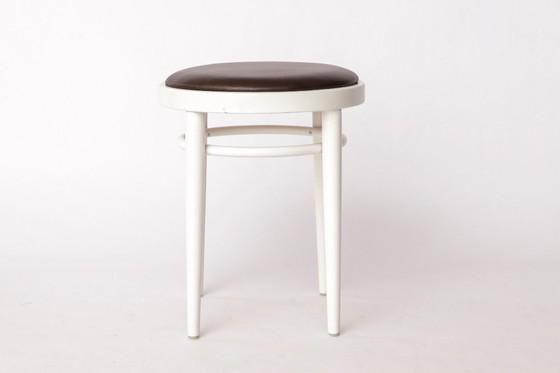 Sgabello vintage Thonet - Legno laccato bianco con seduta in pelle marrone - Anni '90-2000