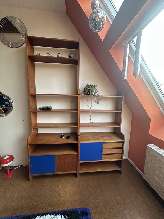 Iconico sistema a parete modulare progettato da Paul Cadovius, noto per i suoi intramontabili design scandinavi che combinano funzionalità ed estetica. Questo sistema è realizzato in legno caldo e accuratamente rivisitato da me con accenti blu e verdi intensi, che gli conferiscono un carattere potente, grafico e contemporaneo senza sminuire il design originale.