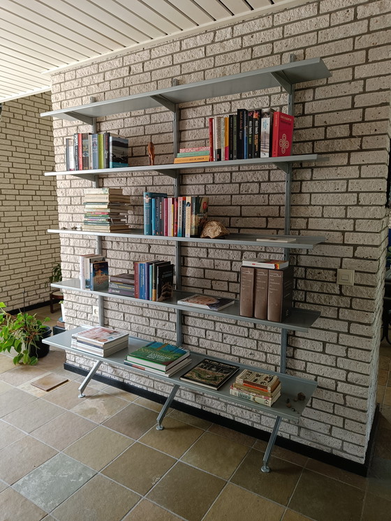 Splendida parete attrezzata di alta qualità con ripiani regolabili. Design unico di metà secolo moderno con supporti a pavimento. Ancora in perfette condizioni. Acquistato in passato presso il negozio di design Summit di Eindhoven (non più esistente).
