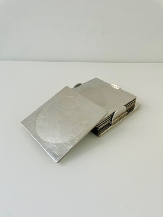 Eleganti sottobicchieri vintage di IKEA, modello GROGGY. Questo set è composto da sei sottobicchieri quadrati in acciaio inox, riposti in un apposito supporto coordinato. Il design è minimalista e geometrico, con un sottile cerchio sulla superficie che aggiunge un tocco grafico.