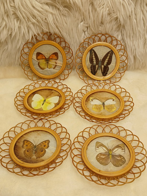 Questo set di sottobicchieri vintage in bambù, decorati con vere farfalle dietro vetro, aggiunge un tocco di natura e fascino a qualsiasi tavola. I delicati dettagli delle farfalle sono splendidamente incorniciati dal bambù intrecciato, creando un look unico ed elegante. Perfetti per gli amanti dell'arredamento retrò e naturale. Possono essere utilizzati come sottobicchieri o come originali decorazioni murali.