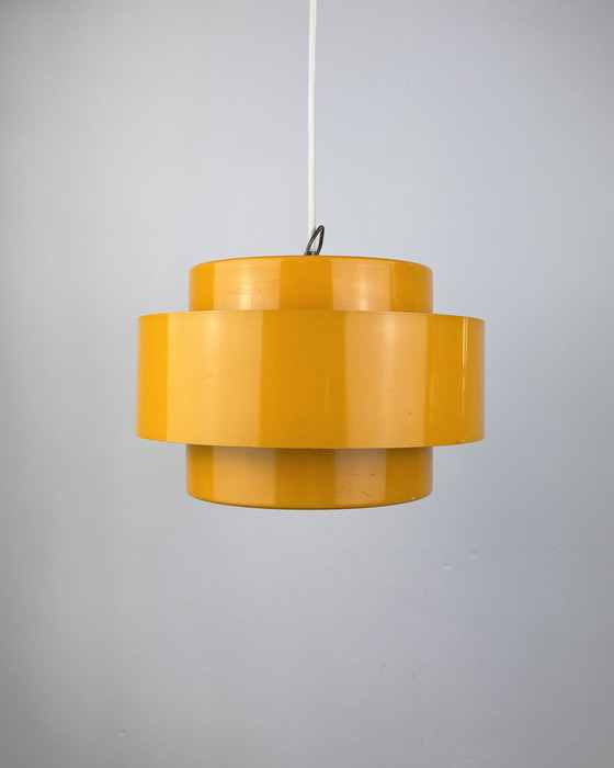 The Juno pendant lamp represents a pinnacle of Danish mid-century modern lighting design, created by renowned designer Jo Hammerborg for Fog & Mørup in 1966. It features three layered cylindrical metal shades in a warm yellow finish, embodying the minimalist elegance and timeless aesthetic that defined Scandinavian design of the era. The lamp’s geometric composition creates a unique interplay of light and shadow, casting warm, inviting illumination while serving as a bold statement piece.