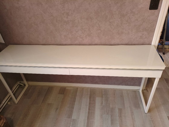 Struttura in metallo bianco, piano in vetro temperato bianco. Due ampi cassetti scorrevoli. Unità monoblocco; solo i cassetti sono estraibili (è piuttosto pesante).